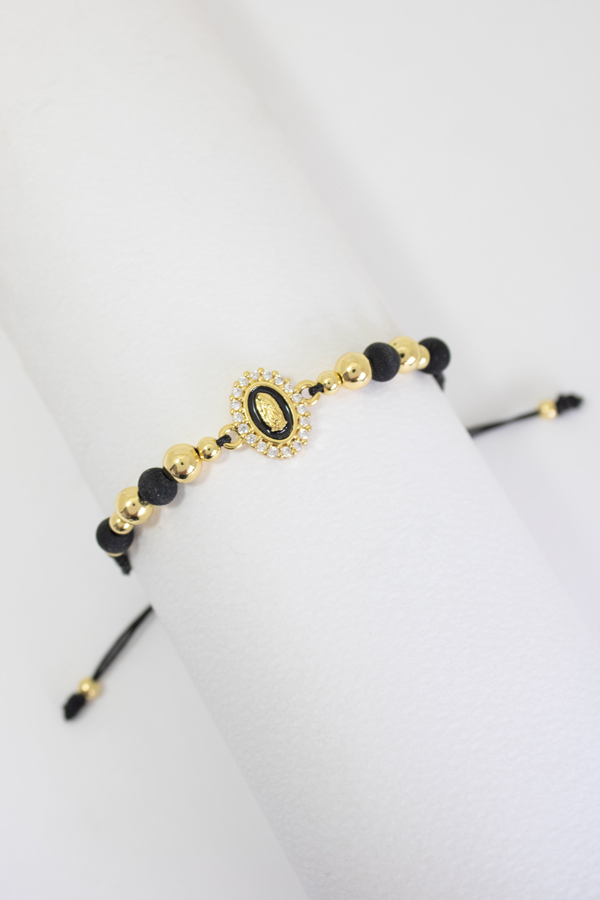 Pulsera unisex con dijes y balines en rodio, tejida a mano, con hilo coreano, dije central en forma de Virgen de Guadalupe con cristales.