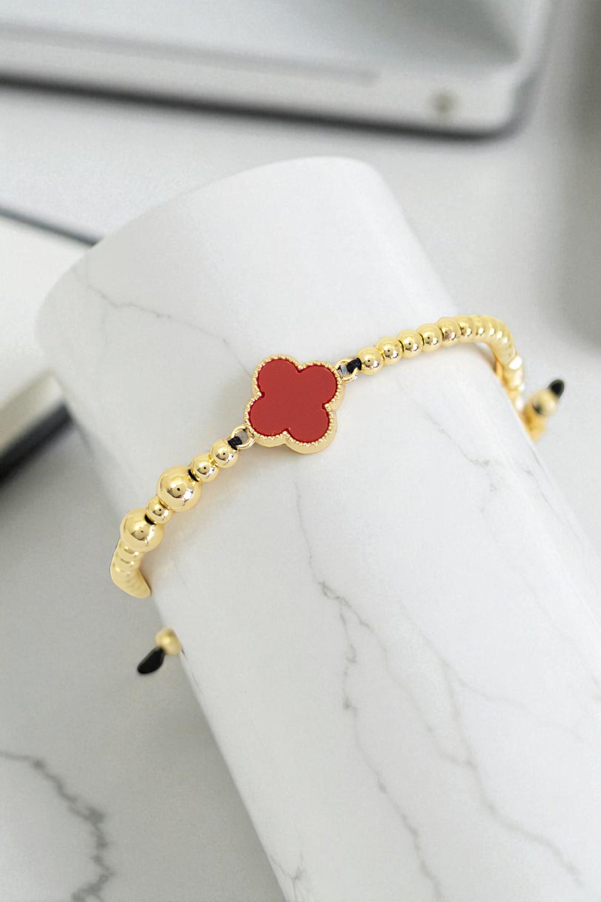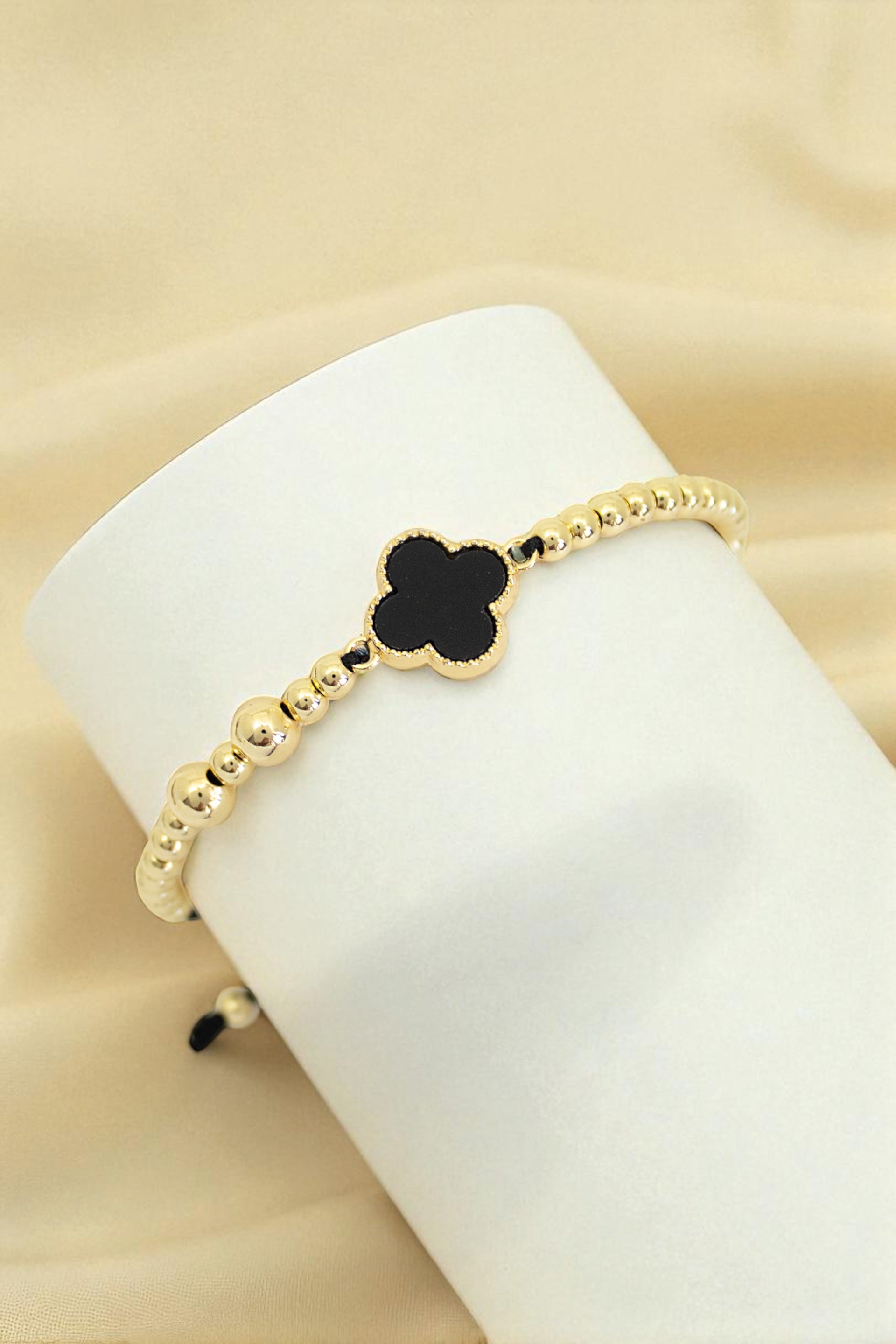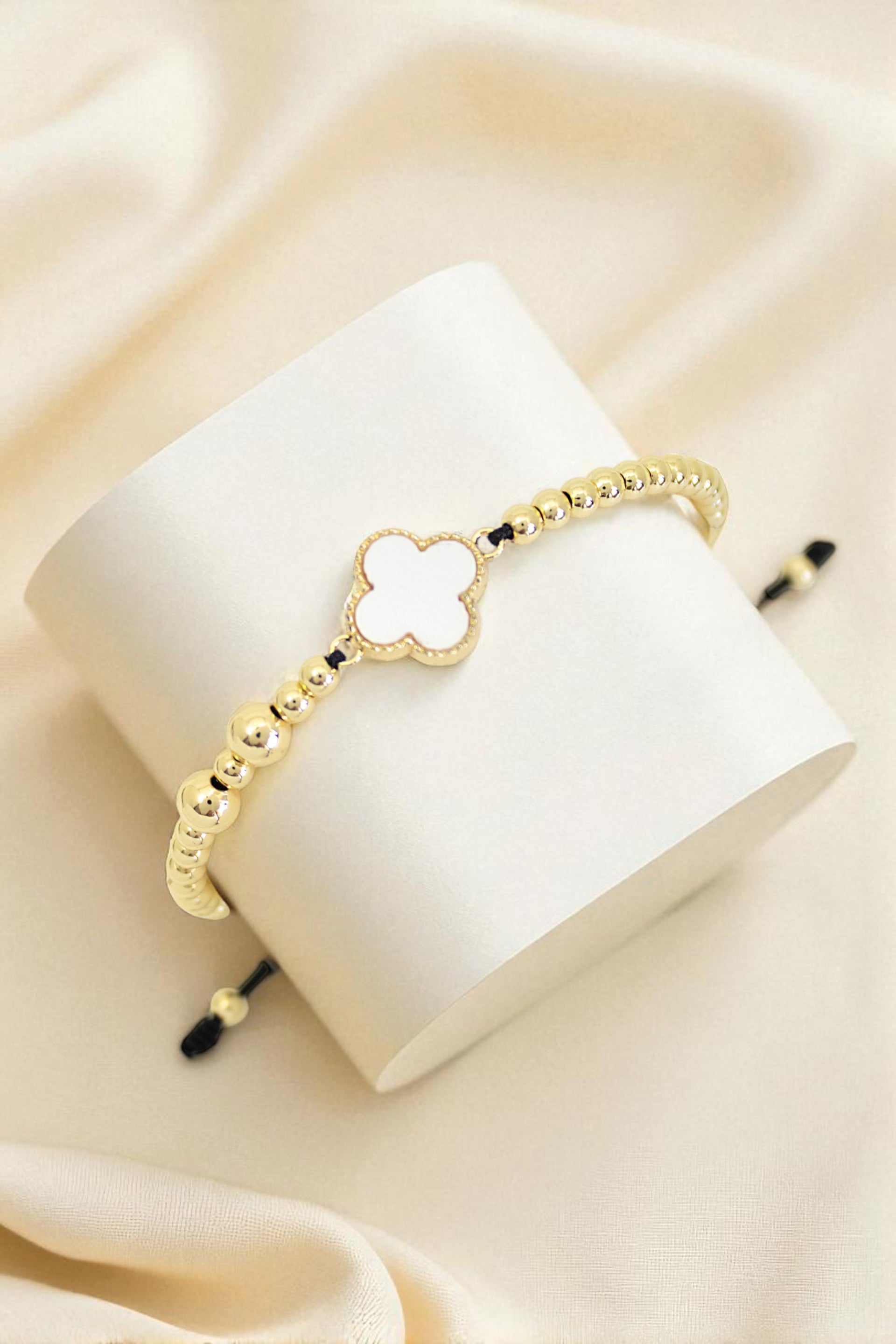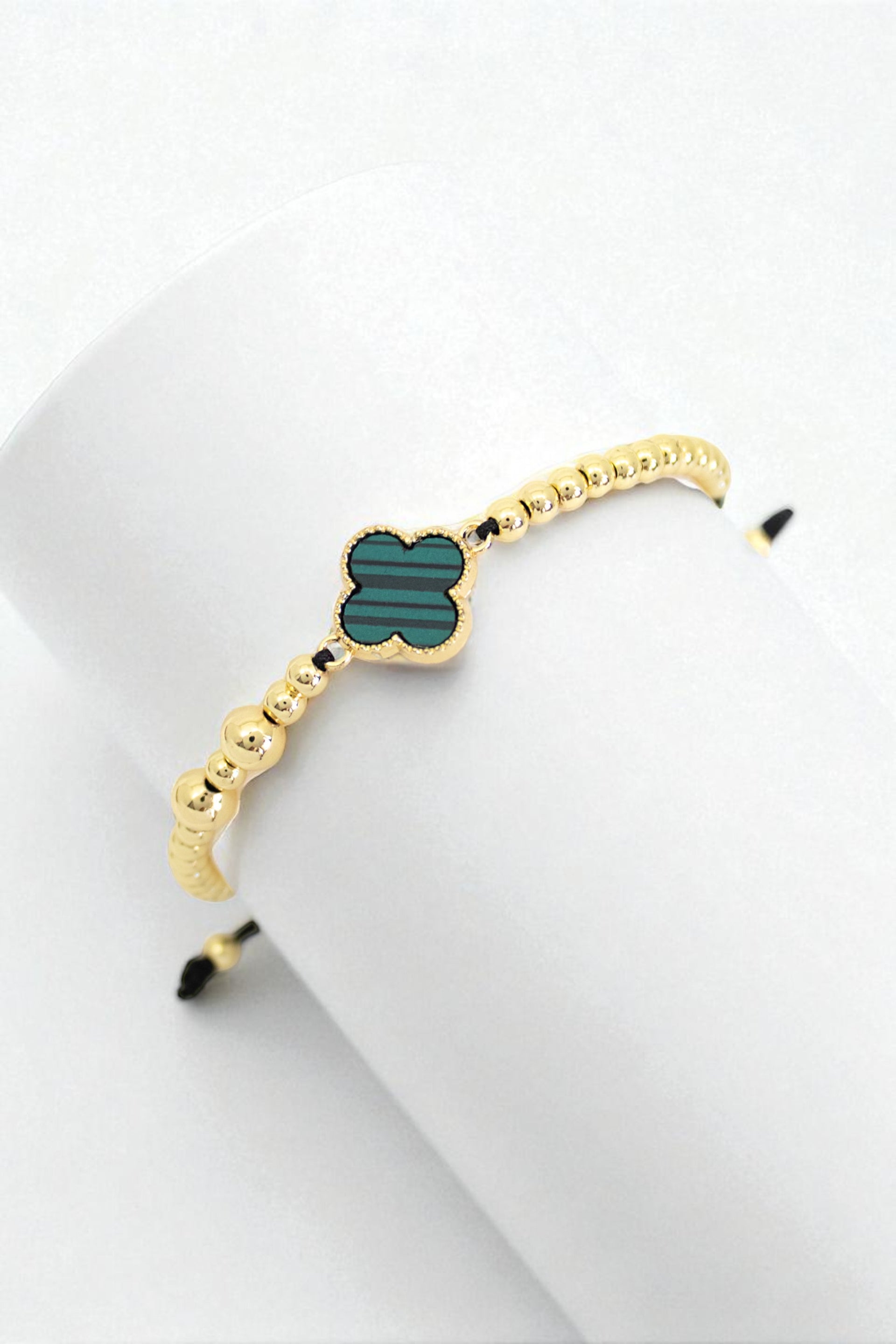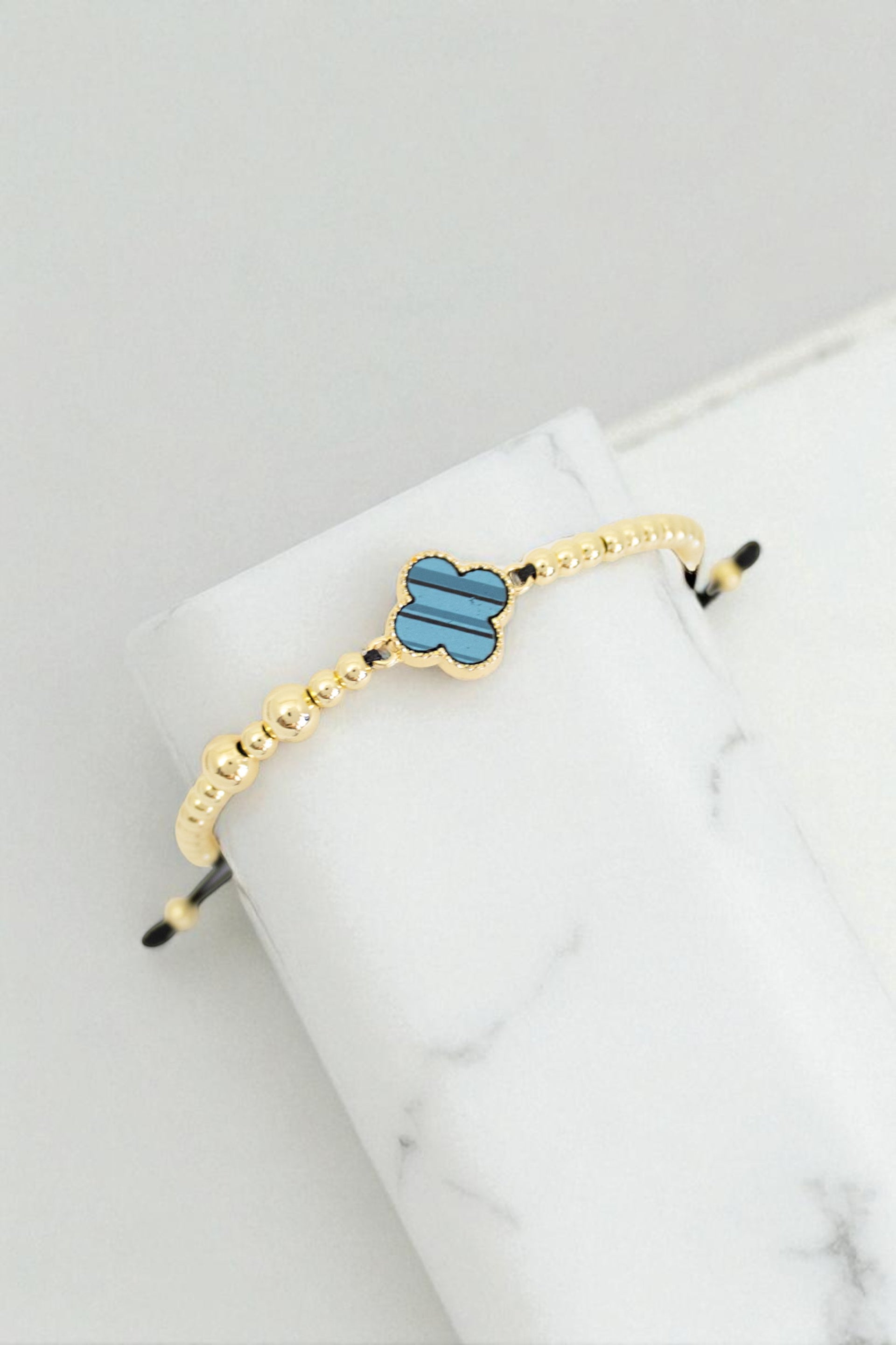 Pulsera unisex con dijes y balines en rodio, tejida a mano, con hilo coreano, dije central en forma de trébol.